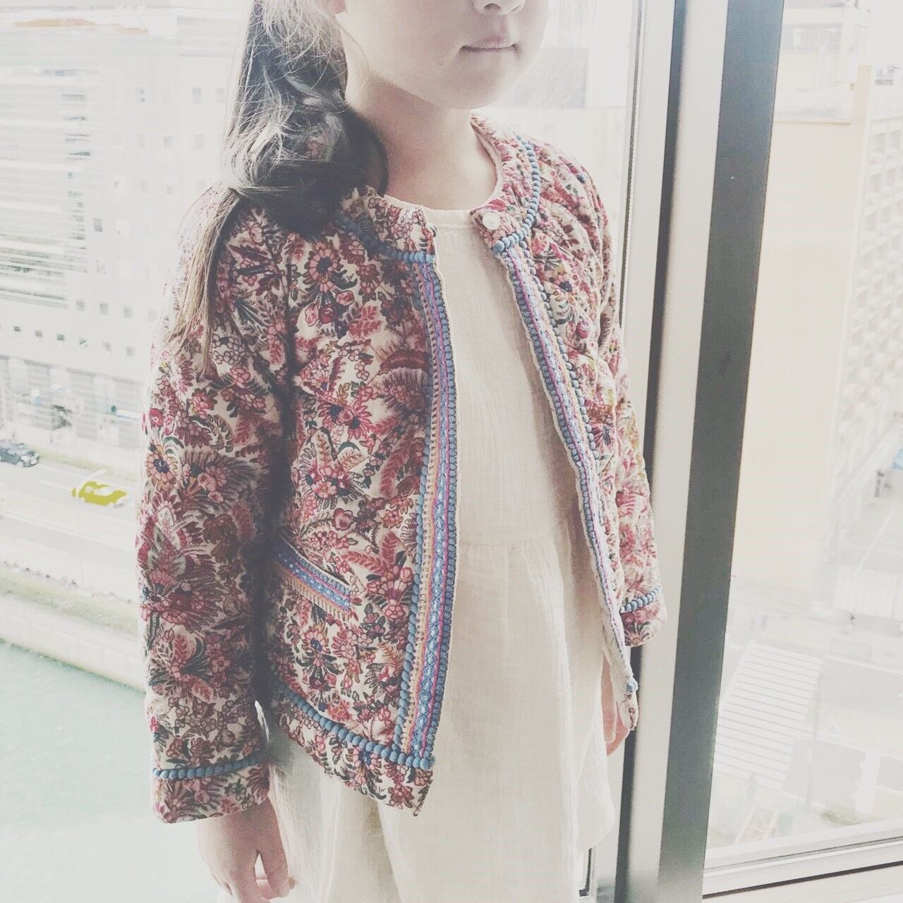 色合いがなんとも可愛いキルトのフラワーノーカラージャケット。ショート丈でとってもオシャレ♡